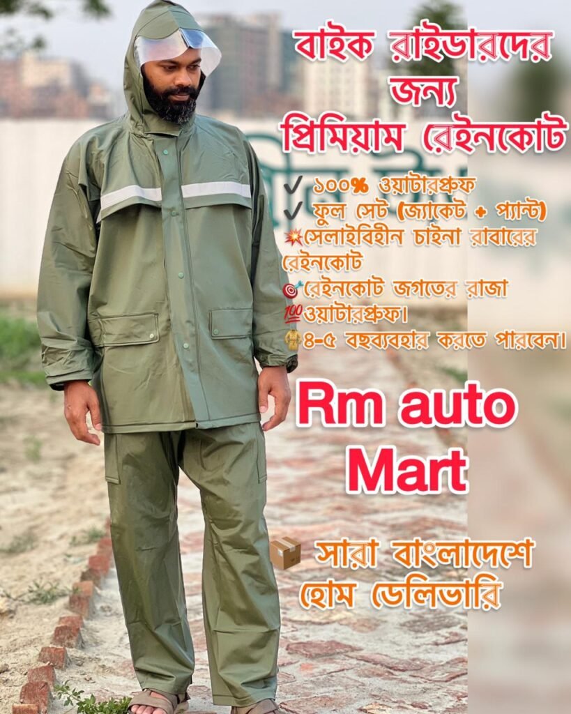 ✔ ১০০% ওয়াটারপ্রুফ ✔ ফুল সেট (জ্যাকেট + প্যান্ট) ✔ প্রিমিয়াম রাবার ম্যাটেরিয়াল ✔ বাইক রাইডারদের জন্য স্পেশাল ডিজাইন